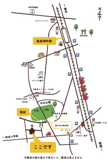 阪急宝塚線の岡町駅から徒歩8分、曽根駅から徒歩9分。教会は閑静な住宅街の中にあります。 下のメニューから、教会までの道の様子を写真でご覧になることができます。道順など、不安でしたらお気軽にお電話ください。Tel: 06-6850-3123 〒561-0883 豊中市岡町南2-9-18
